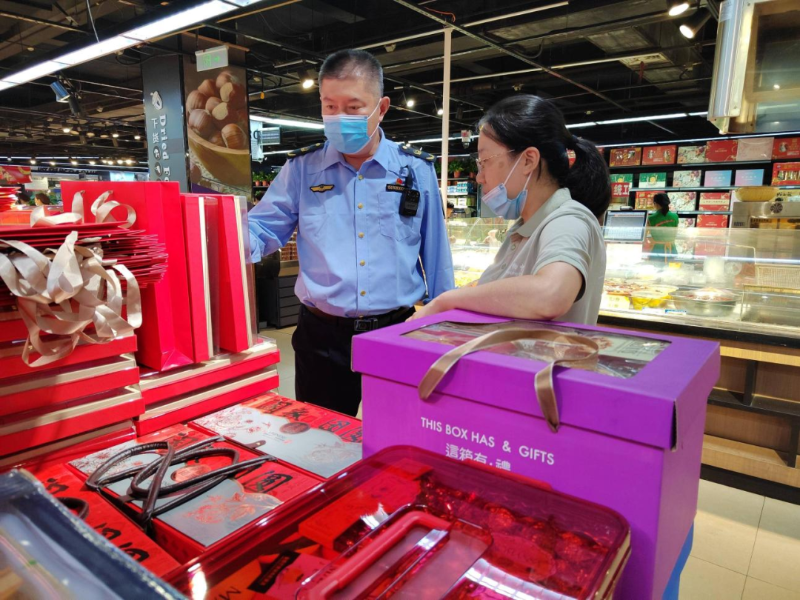 同时,执法人员还对在售的月饼包装材料、包装层数、包装空隙率、包装成本等指标进行认真检查,杜绝月饼过度包装,并督促商家明码标价、诚信为本。