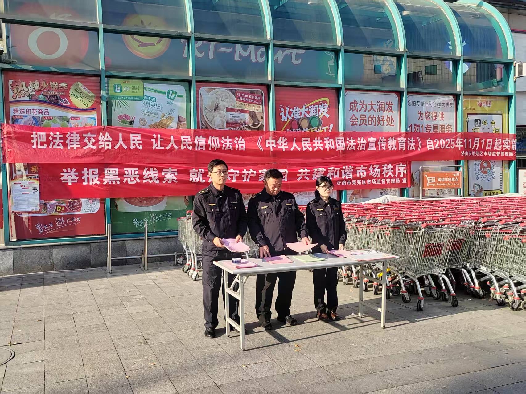 11月14日,莱芜区市场监督管理局集中开展《中华人民共和国反有组织犯罪法》和破坏市场经济秩序的普法宣传活动。