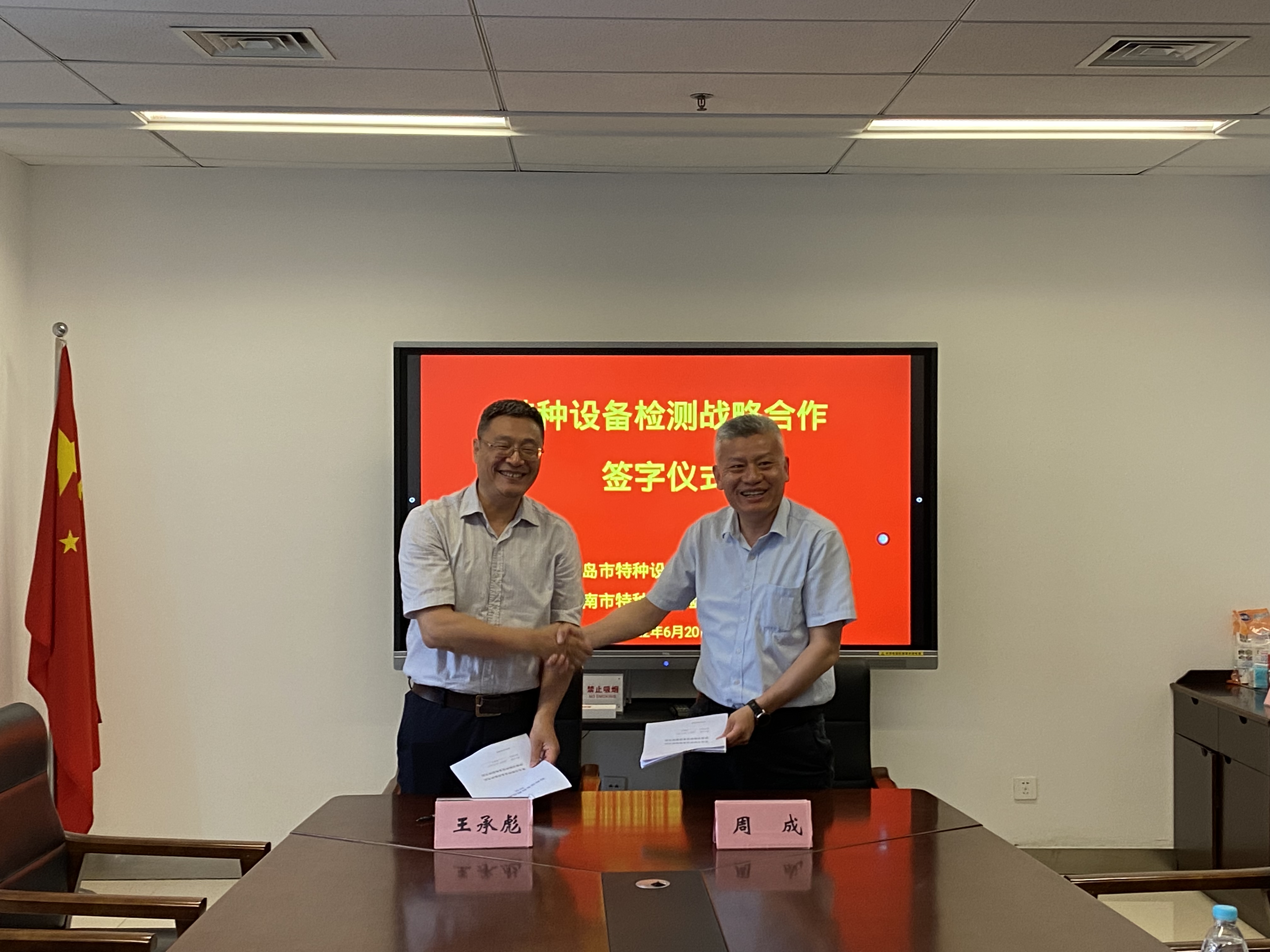 2022年6月20日,青岛市特检院周成院长一行4人到济南市特检院考察交流,济南市市场监管局分管领导、二级巡视员孙建忠、济南市特检院院长王承彪等参加座谈。针对严峻的特检市场环境、新核准规则执行中存在的问题、检测技术人员管理及科研开发等方面进行了深入交流和探讨。