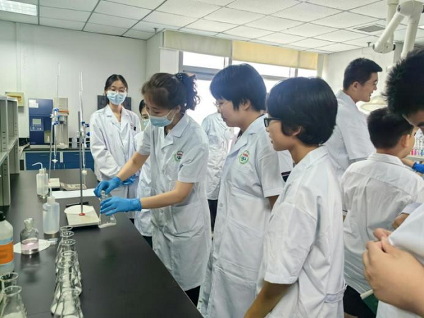 在实验室沉浸体验环节。学生们参观实验室仪器设备,中药标本室陈列的千余种特色药材让同学们直观感受到传统中药文化的魅力。在专业人员指导下,亲手操作感受食品紫甘蓝变色反应,检测牛奶的酸度判断牛奶的新鲜程度。“原来课本里的化学方程式真的能变成检测武器!”参与实验的某中学学生兴奋地表示。