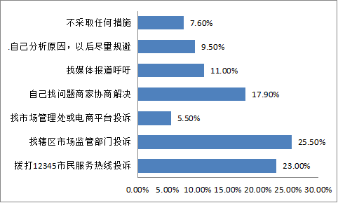 数据显示,市民选择找辖区市场监管部门投诉的比例最高,为25.5%,占首位。说明当市民遇到食品安全问题时,向市场监管部门投诉成为解决渠道的首选,显示市民对主管部门的高度信任。其次,12345市民服务热线作为市民解决诉求的官方平台,其公信力被市民认可,选择拨打热线投诉占比也较高;随着网络平台的不断规范,市民自己找商家自己解决的比例为17.9%,占第三位,说明市场规范和诚信体系已经较为完善;找媒体报道呼吁的比例占11%,说明媒体监督功能被部分市民认可;自己分析原因,以后尽量规避,占比9.5%,说明部分市民对食品的选择和鉴别能力不断提升;不采取任何措施占比7.6%,说明食品安全法律法规的宣传还要加强,不断提升市民维护自身合法权益的法律观念和意识;找市场管理处或电商平台投诉的比例分别占5.5%,占比最低。