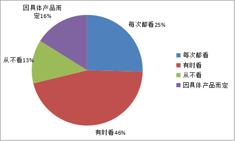 调查问卷中,针对“购买食品时,您看不看生产日期及保质期”一题,有近八成受访者表示对此关注。其中,每次都看的占25%,占受访者总数的四分之一;46%的表示有时看,对生产日期和保质期的关注度也较高;因具体产品而定的占16%;从不看的占比最少,占13%。表明人们对食品的生产日期和保质期的关注度还是比较高的。数据分析,有四分之三的受访者没有选择每次都看,除去嫌麻烦的因素外,也从另一个侧面反映出对市民对商家售卖产品的放心和对食品监管部门的信任。