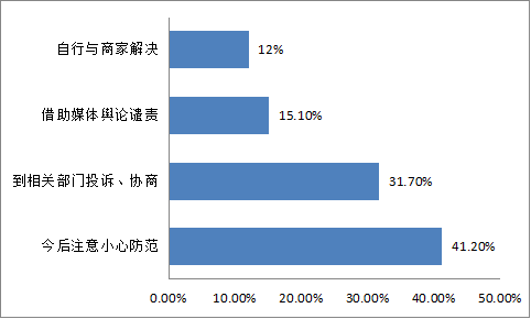 调查问卷中“如果遇到食品生产经营业户不讲诚信的情况,您会如何处理?”一题,有41.2%的受访者表示会“今后注意小心防范”,俗话说“吃一堑长一智”,遇到类似问题,人们把注意规避和防范放到了首位。选择到相关部门投诉、协商的占31.7%,说明有三成的受访者法律意识较强,自觉拿起维权武器维护自己的合法权益;借助媒体舆论谴责占15.1%,通过媒体曝光维权也是当今舆论监督的一个途径;自行与商家解决占12%,在法律法规约束下,协商解决也不失为一种良好的解决问题方式。