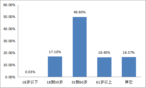 问卷显示,10857名参与问卷者年龄情况如下:18岁以下4人,占受访者的0.03%;18到30岁1853,占17.10%;31到60岁5420,占;61岁以上1779,占16.40%;其他1801人,占16.57%。从受访者年龄分析,31到60岁年龄段参与人数最多接近半数,占49.90%。