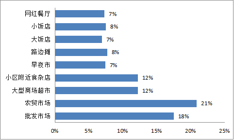 在问卷中给出的9个最担心场所食品安全隐患选项中,农贸市场位列榜首,占21%;其次是批发市场占18%;小区附近食杂店和大型商场超市各占12%;路边摊、小饭店各占8%;早夜市、大饭店、网红餐厅各占7%。