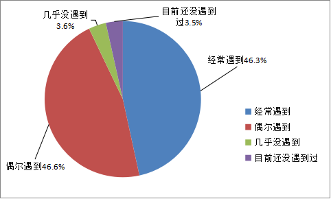 数据显示,市民遇到食品安全问题的现象较为普遍。在问卷第一题“您或者您身边的人,遇到过食品安全问题吗?”给出的四个选项中,经常遇到5055人,占总受访者的46.3%;偶尔遇到5024人,占46.6%;人,几乎没遇到389占3.6%;目前还没遇到过389人,占3.5%。