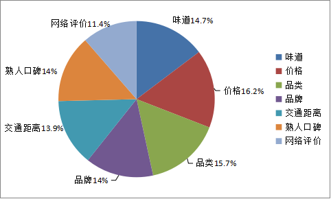 调查问卷中,针对“选择餐厅或餐饮外卖商家时,您会考虑哪些因素”一题,受访者把价格和品类作为首选。其中,价格占16.2,位居首位;品种多、可选择性强,也成为考虑的重要因素,从数据看,品类一项占比15.7,位居第二;其次,味道占比14.7%,说明食品的口味在选择餐饮时也是消费者着重考虑的一个方面;熟人口碑和品牌分别占14%,说明品牌效应和口口相传也是餐饮行业应该注意的一个方面;交通距离占13.9%,仅次于品牌和口碑;网络评价占比最低,占11.4%,说明人们能理性的看待网络评价的真与伪,多方面的衡量、选择自己喜欢的就餐商家。