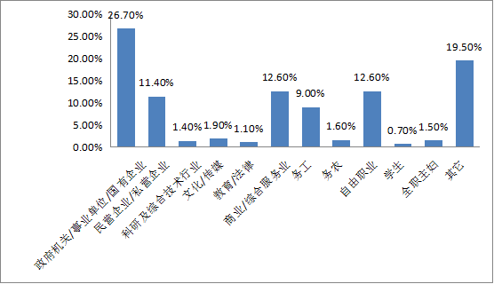 问卷显示,10857名参与问卷者从事职业情况如下:政府机关/事业单位/国有企业2901人,占26.7%;民营企业/私营企业1235,占11.4%;科研及综合技术行业136人,占1.40%;文化/传媒202人,占1.90%;教育/法律109人,占1.1%;商业/综合服务业1373人,占12.60%;务工996人,占9.00%;务农177人,占1.6%;自由职业者1373人,占12.6%;学生82人,占0.70%;全职主妇153人,占1.5%。其它人群2120人,占19.5%。从受访者职业类型分析,政府机关/事业单位/国有企业人员参与度较高,市民群众、网友参与度广,收到很多有价值和中肯的意见和建议。